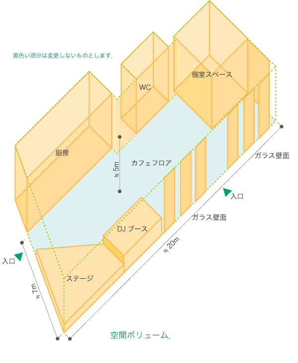 場所は具体的な店舗を設定しますが,第一段階の提案においては,アイデアそのものの魅力,可能性を重視し,プランの具体性は問わないこととします.そのため,1次審査の段階では,エリアと,概要平面図等のみ公開します.ただし,実際の計画は原則として現状平面および給排水設備の変更はしないもの(給排気設備の変更は可)とします.