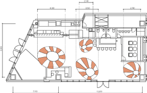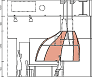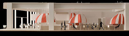 分煙空間を考えた時,喫煙する場所は1カ所にまとまっているのではなくカフェのさまざまな場所でたばこが吸われていて,またそれは今まであるような喫煙空間とは違い,ポジティブなイメージを空間に与えるものを目指した.このカフェでの分煙はパラソルと大きなテーブルからなり,テーブルで大まかにエリアは区切られ,それにかかるパラソルは喫煙空間を示す.カフェにきた人はその時の喫煙状況と自分の嗜好から席を選び,テーブルの周囲に沿って席ができ上がっていく.パラソルは上下し,煙が迷惑になっていないときや人が少ない時は高く吊ってあり,喫煙者が多い時やカフェの密度が高い時は低く吊られ開放度が下がる.その時々の煙によってカフェは変化し,ゆるやかな喫煙風景が広がることを目指す.