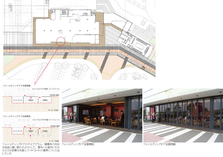 室内空間でありつつ,開放すると屋外的な空間になり得て,客席もあるので食事をしたり,非喫煙席と変わりがない状況で喫煙できる.寒い時は折れ戸を閉ざすこともできる.外の空間と連動させつつ場を快適にする発想の方向性を評価したい.