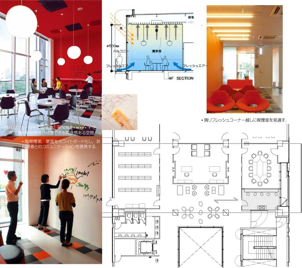 喫煙室を大きく明るくして,非喫煙者も入りたくなるスペースにしたところがよい.