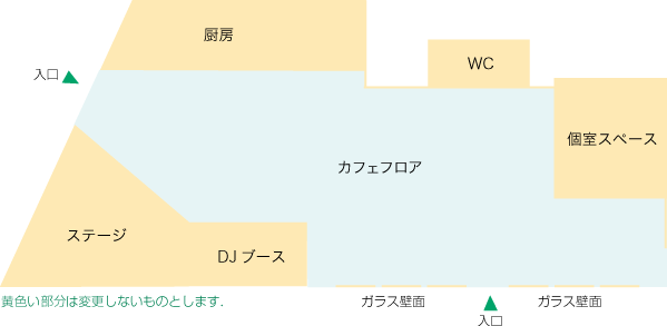 昼間はカフェ,夜はお酒が飲める場所になります.ステージやDJブースがあり,パーティやイベントも行えるスペースと考えてください.