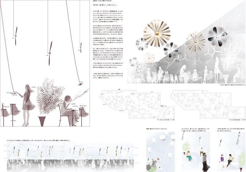 - いくつかあった風車案の中では,イメージとリアリティを両立させた案でした.風上と風下をつくることで天井のペンダント照明などもふわっと揺れるというイメージはとても面白く,煙も解決できているのがよいです.ただし,この気流をつくるために,ファンの固定方法や排気口や空調の吹き出しやレターンはどうなるのかなど,具体的な提案を見たいです.
