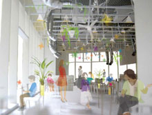 カフェの中に一方向の気流をつくり,風上と風下をつくる.無数の風車がその気流の速度や向きを視覚化する.気流の流れを見ながら,他の人との距離やたばこの煙の行方に気を配りながら,好きな場所を選ぶ. カフェに溢れるものの,大きさや量や配置の仕方をほんの少し変えるだけで,分煙カフェになればと思っていた.分煙カフェでも, そう見えないくらいがいい.
