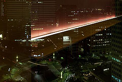 ガラスに映り込む喫煙室の明かり.