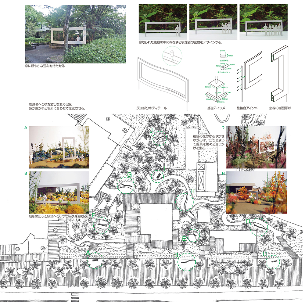 都市の美しい緑に目を向けるための仕掛けとして,大きな窓を提案する.窓の形をした灰皿は,風景を縁取ることでその美しさを際立たせ,その中にたばこを吸う人の居場所をつくる.窓辺の風景を占める密度はデザインされており,たばこを吸う人は風景を引き立てる存在として認識される.また,大きな窓の中で人の密度をデザインすることは,煙との距離を保つことでもある.そして,窓の歪んだ形状は,たばこを吸う人と吸わない人のたまりを同時につくる.たばこを吸う人は,窓越しに美しい緑を眺めながら一服し,吸わない人は,緑道を歩き気付かなかった風景の魅力に目をとめる.この窓は,たばこを吸う人と吸わない人を繋ぐ窓であり,都市の緑と人びとを繋ぐ窓である.