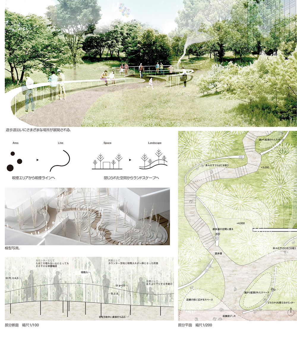 豊かな木々に囲まれた都市の中で,従来よりも少しおおらかな分煙のあり方を考えたい.一般に,たばこが吸える場所と吸えない場所は,エリアを分割することで分煙を成立させてきた.ここでは,丘に等高線を描くように,喫煙可能なラインを描き,緩い関係性をつくる.特定のスペースに喫煙場所が固まることはなく,たばこを吸う人/吸わない人がレイヤー状に重なり,表裏のないスポットが広場に点在する.ラインは,少人数で組立て可能な単純な構造体で,大小さまざまなランドスケープをつくることができる.コーヒーカップを置いたり,腰かけたり,手摺りのように使うことができ,ランドスケープ全体が人びとの自由な振る舞いの受け皿となる.木々の間を通り抜けるラインは,都市で生きる人びとの居場所と,誰もが立ち寄りたくなる都市の風景を形成する.