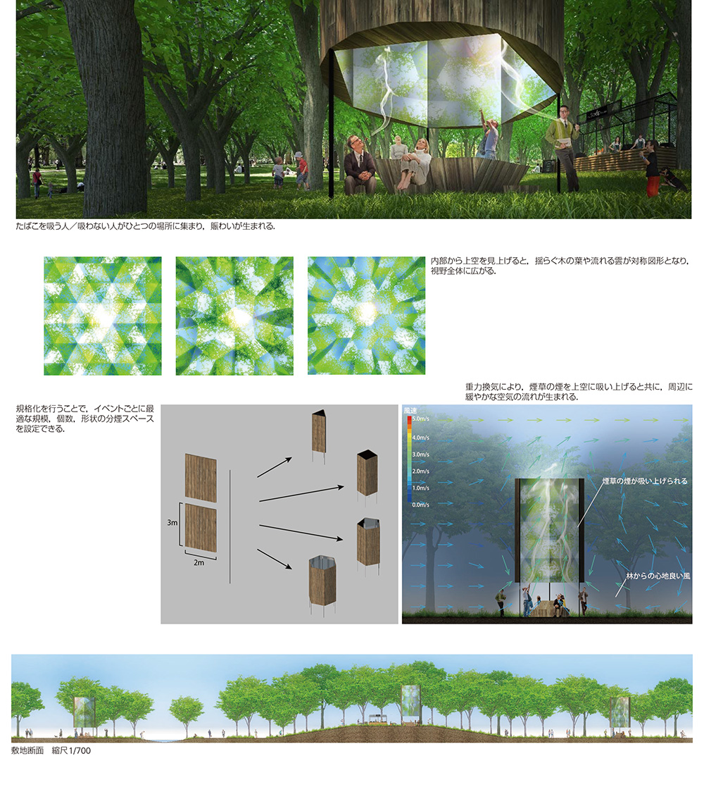 風を感じる緑の万華鏡空間.高さ6mの煙筒を喫煙スペースに設置.重力換気により,周辺の煙を上空に排出する.煙筒内に取り付けられた鏡板は太陽光を反射し,たばこが吸える場所を明るく照らす.内部から上空を見ると,視界全体に無限に広がる樹木の枝葉や空模様が広がる. 自然の動きに伴い,変化し続ける対称図形は,自然のアートとしてたばこを吸う人以外にも親しまれる.鏡板の枚数/角度が異なることによって,それぞれの場所で違う図形を楽しむことができる.