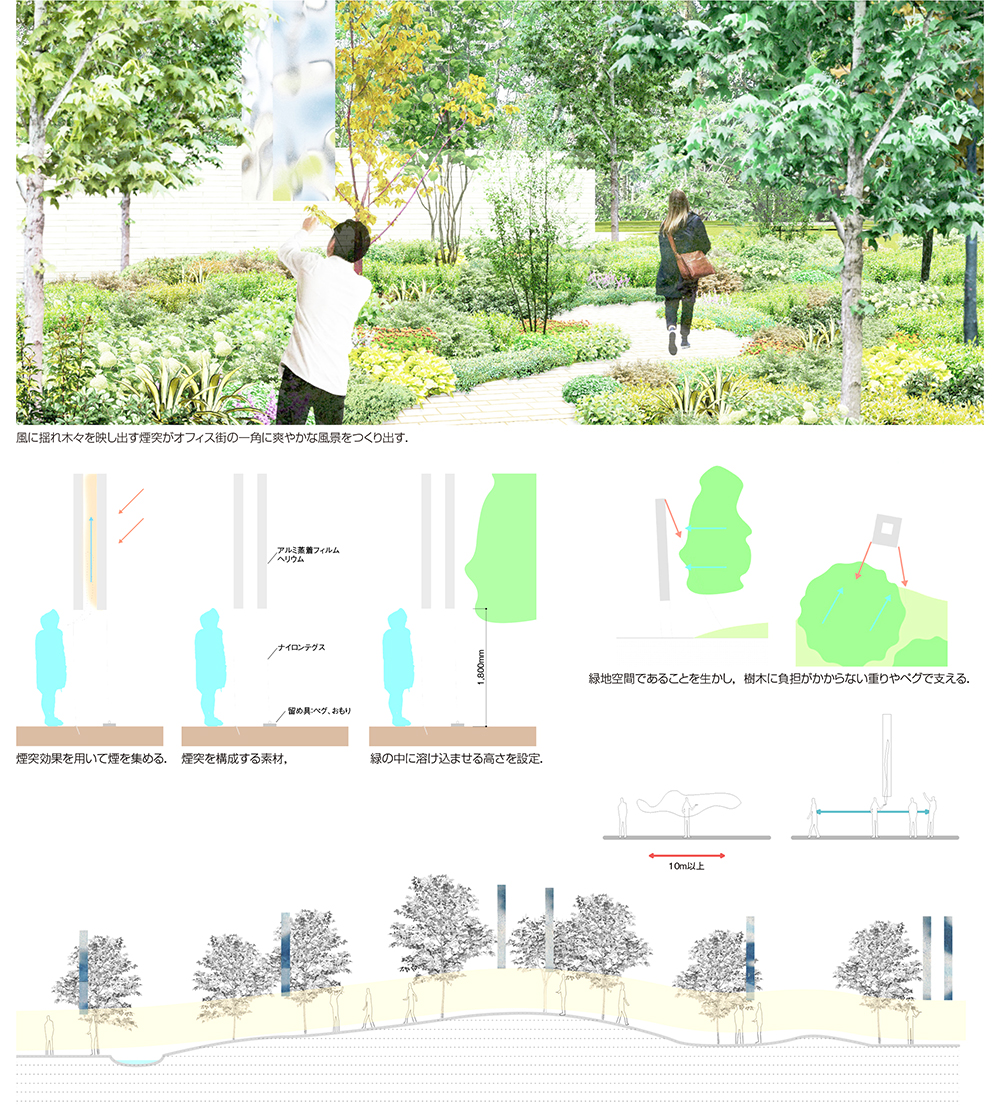 煙突状の風船をヘリウムガスで満たし,人びとの頭の高さに浮かべる.太陽光を蓄熱し煙突内の温度が上昇すると煙突効果が発生し,煙突の下の空気を吸い上げる.その下でたばこを吸うと,上昇するたばこの煙を煙突が吸い上げるというわけである.横に広がってしまう煙を縦方向に引き上げることで,たばこを吸う人も吸わない人も隔たりなく緑化空間を使える.ペグ(小さな杭)や重りで地面にとどまるこの煙突は,緑地空間に対する負荷が少なく,設置も容易で,さまざまなアクティビティに対応し設置場所を変えることができる.風船はアルミ蒸着フィルムでできている.アルミ蒸着フィルムは気体の透過率が低く,反射性に富む素材である.風の中に揺らぐ煙突が周囲の木々を映し出し,緑化空間をより爽やかな景色につくり変える.