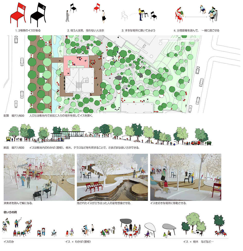 この提案に,大掛かりな設備や空間は必要ない.人びとの行動によって分煙空間が生まれる仕組みを考えた.敷地内に自由に動かすことのできるイスを点在させる.このイスにはひとつだけルールが存在する.たばこを吸う人は黒,吸わない人は赤のイスを使うことである.お互いの存在が明確になるので,たばこを吸う人は吸わない人に配慮して距離を取って座ったり,逆にたばこを吸わない人同士が集まることで,場の意思が表示されたりするかもしれない.使い終わり置き去られたイスの配置には,人びとの分煙への気遣いが表れ,後から来る人へその気遣いを伝える.周囲の環境,時間によって刻々と変化する分煙空間である.