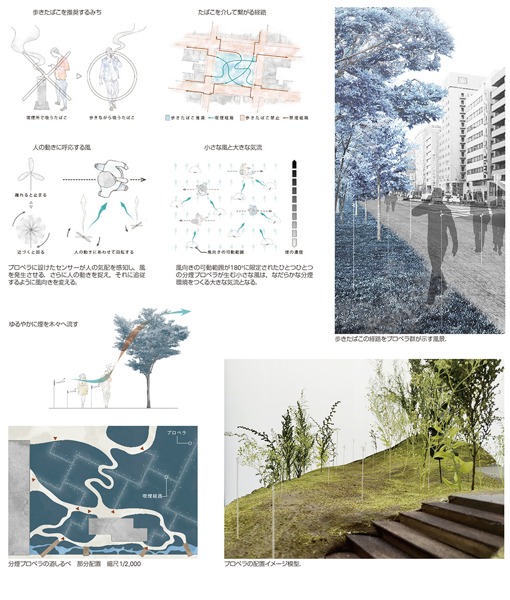 たばこを吸う行為の周辺にはたくさんのルールが設定されている.そうしたルールのおかげで,たばこを吸う人,吸わない人が社会の中でうまく共存できている.一方でそのルールが厳しく,人びとの行為が制約されすぎている側面があるようにも思える.そこでそんな頑ななルールをひとつ破ることで,人とたばこの関係を大きく変えることができないかと考えた.たとえば都市の中で「歩きたばこ」が許される時,どんなことが起こるだろうか? 「たばこを吸う」というミクロな行為が「歩く」行為を伴う時,たばこを媒介として人びとは敷地の境界を超え,マクロに活動を展開していく.歩きたばこを推奨する喫煙経路がこの場所と都市とを繋いでいくのである.