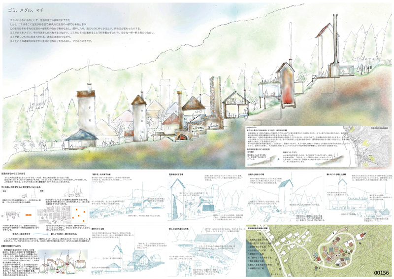 提案として,ひとつに固められたゴミの収集所を解体し,町の中にモノの種類によって収集所や焼却炉を点在させます.人は出すモノによって町中を動きます.一番ゴミの集まる燃えるゴミと人の集まる公民館,その熱を使う銭湯,ペットボトルと災害用水,食料のストック倉庫,生ごみと植林場,肥料精製所,いらなくなったモノとモノで賑わう市場など.ゴミと人とまちがリンクしはじめます.