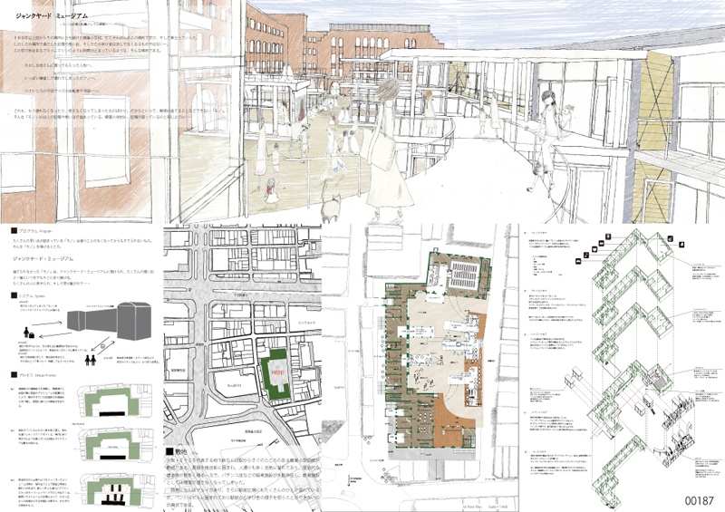 使わなくなった「モノ」を預かり,それらを展示品とすることで成り立つ博物館.家具や楽器・レコードや本・写真など,集める「モノ」のジャンルは問わないが,すべて持ち主が捨てるに捨てられない想い出の品ばかりである.システムとしては,持ち主がジャンクヤードミュージアムに預けたときに,持主側へインセンティブが支払われる.金銭的メリットによって,想い出の品は難波に集まり展示品が充実し,たくさんの観光客や周辺住民がここを訪れ,預けられた「モノ」を見たり手に取ったり使ってみたりすることで楽しむことができる.そこで発生した見物料や使用料と,新設部分のテナント料で収支のバランスをとる.コンバージョンによって都市建築を利活用し,「古いものは古いままでいい」というジャンクヤードミュージアムによって消費社会著しい現代への意思表示とする.