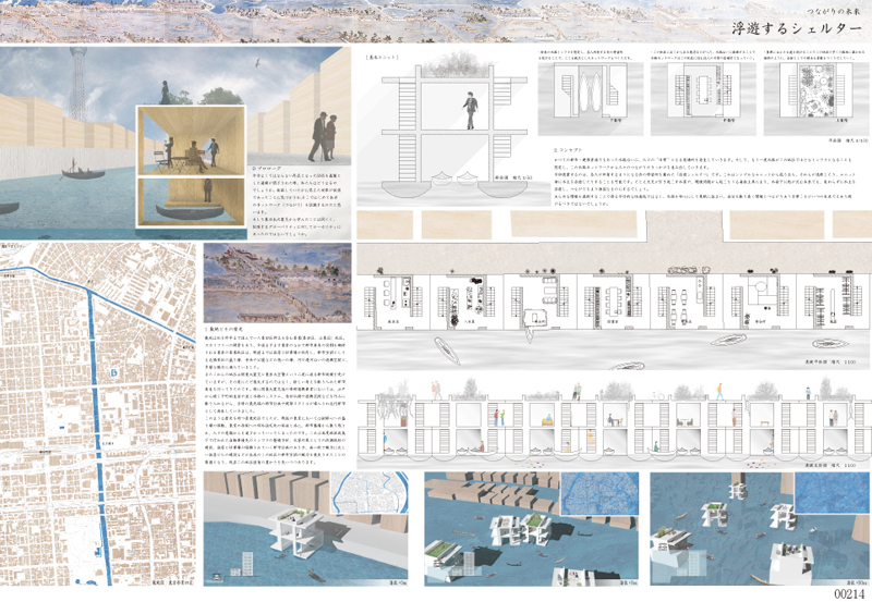 今後東京の都市再生の役割を期待される墨東(墨田区,江東区)地区.かつての都市・建築資源でもあった水路沿いに,人々の「日常」となる居場所を再生していきます.今回提案するのは,各人が所有する舟の停留所を兼ねた「浮遊シェルター」です.これはシンプルなユニットから成り立ち,それらが連続したり,ユニット毎に水上を浮遊したりすることも可能です.たとえ天災が引き起こす水害や,環境問題から起こりうる海面上昇により,水面下に街が沈む未来でも,変わらずに水上を浮遊し,つながりをより強固なものにするでしょう.あらゆる環境を遮断することで得る今日的な快適性ではなく,水路を中心にして柔軟に住まい,自分を取り巻く環境とつながりあう日常こそがいつの未来でもあり続けるべきではないでしょうか.