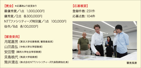 私どもNTTファシリティーズは,これまで培ってきた確かな技術力で新しい街づくりに挑戦しています.それは,都市や建築,エネルギーなどの「環境」を,より良いものにしてゆく総合エンジニアリング企業としての社会貢献であると考えます.本コンペのテーマである「つながり」とは,過去から現在,そして未来の発展へと続く多様な視点を持つことに他なりません.同時にそれは,「IT・エネルギー・建築」を融合し,最大限に活用することによって,さまざまな問題に対応できる社会を創り出すための「技術のつながり」でもあります.応募頂いた多くのアイデアや提案を活かして,私どものスローガンである「Smart&Safety=便利で安全な社会」の実現のため,これからもたゆまぬ努力を続けてまいります.なお,応募作品の中で当社の理念や事業内容にふさわしい,新しいスマートな街づくりを想起させる意欲的な作品に対し,「NTTファシリティーズ特別賞」を新たに設け,表彰させて頂くこととしました.