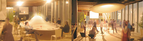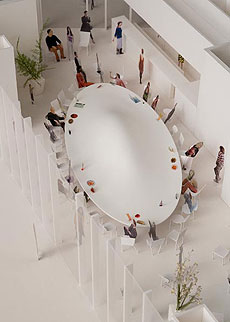 私たちが提案するカフェには,中央が緩やかに膨らんだ大きなテーブルがひとつあります.このテーブルの大らかな形状は,人びとの間にお互いの存在を感じながらも自分の時間が過ごせる,緩やかな距離感をつくり出しています.また,その外周部から中央に向かって吹き出される気流と,中央部の発熱がつくり出す上昇気流によって(コアンダ効果),たばこの煙はテーブルをのぼっていきます.