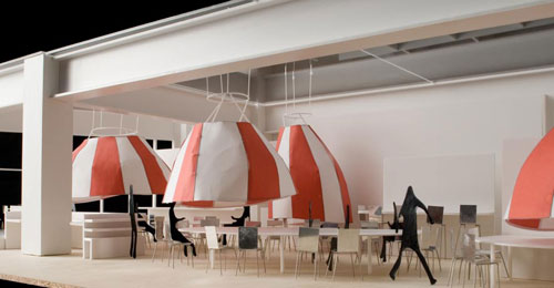 分煙空間を考えた時,喫煙する場所は1カ所にまとまっているのではなくカフェのさまざまな場所でたばこが吸われていて,またそれは今まであるような喫煙空間とは違い,ポジティブなイメージを空間に与えるものを目指した.このカフェでの分煙はパラソルと大きなテーブルからなり,テーブルで大まかにエリアは区切られ,それにかかるパラソルは喫煙空間を示す.カフェにきた人はその時の喫煙状況と自分の嗜好から席を選び,テーブルの周囲に沿って席ができ上がっていく.パラソルは上下し,煙が迷惑になっていないときや人が少ない時は高く吊ってあり,喫煙者が多い時やカフェの密度が高い時は低く吊られ開放度が下がる.その時々の煙によってカフェは変化し,ゆるやかな喫煙風景が広がることを目指す.