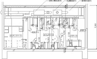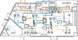 2次案でも考え方は変わらない.既存のカフェは天井が剥がされ,ダクトや機器類が露出し,色々なものが混在していて,街の空気によく馴染んでいる.カフェの質を決めているこうした存在を変えたくない.だから空調の吹き出しと吸い込みは,天井のダクトがそのまま垂れ下がっているようにつくり, 生まれる気流の向きは,そもそもここを流れる自然風の向きに合わせることにした.
