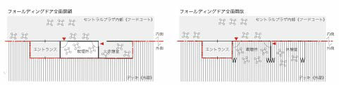 この施設の大きなコンセプトは,デラックストイレと呼ばれるトイレがあることです.高速道路のPAに寄るいちばんの目的は休憩です.トイレ休憩だったり,たばこの一服休憩だったり,それをしてからお土産などを買いに行くんです.だから,まずいちばんのトイレ,喫煙室をつくりましょうとクライアントに提案しました.今はこのトイレが目玉になっていて,特に女子トイレはホテルのロビーのようなゆったりとした空間になっています.トイレの中に女性専用の喫煙所も設けていて,見られたくない人にも配慮をしています.ここにある他のトイレにもさまざまな工夫をしました.そういう中で,喫煙所も,今までのPAでは片隅においやられ,食事などは持ち込めなかった場所のあり方を見直し,建物と外部の接点に入れ込むかたちで配置して,飲食もできる場所にしました.街のカフェなどで室内が禁煙の場所は,入口の外側に喫煙者用のスペースが設けてありますが,ここは建物内部に入れ込まれているにも関わらず,可動折り戸によって,天気のよい日はシャッターを開けて外部にもなる空間としています.今はたばこを吸う人も吸わない人も,同じ空間の中でくつろぐ姿が見られます.