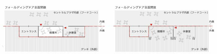 PAの中央に位置する喫煙室パノラマ写真.天気がよい日は可動折り戸が開放されている