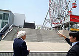 手前が佐藤英治氏.奥が鵜飼哲矢氏.この場所は,愛知県に第二東名高速道路をつくるにあたって(2004年12月開通),高速道路から入るサービスエリア(SA)・パーキングエリア(PA)と都市公園とを一体化した「ハイウェイオアシス」という新しい制度のもとつくられました.しかし制定後,ひと続きの敷地で計画ができるにも関わらず,複数の主体が存在するために,一体化したメリットがなかなか実現できていませんでした.今回は,刈谷市の商工会議所が,ここを運営するために「刈谷ハイウェイオアシス」という会社を設立し,刈谷市と併せて第三セクターもつくりました.その上で,民間の「刈谷ハイウェイオアシス」が公園部分の委託を,第三セクターがPAを請け負う.ただ,「刈谷ハイウェイオアシス」がこの第三セクターの株主ともなったので,実質はひとつの主体で計画を進めることが可能になりました.